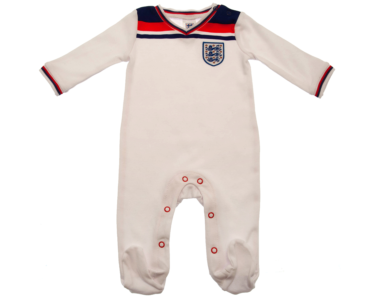 England Baby Sleepsuit 1982 Retro Home - 9/12 Months. Nice white colour sleepsuit for your little ones. It features England FA badge and is made in year 1982 Retro Home shirt theme. Sleepsuit is made of 100% Cotton and will be nice gift for England supporters. Official licensed product.