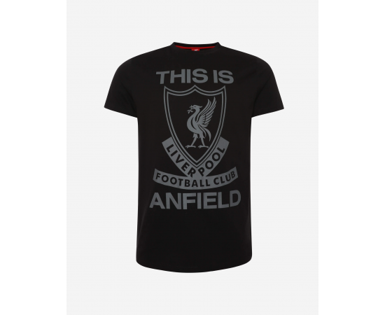 Liverpool Mens T-Shirt - M. It is black in colour and features club crest in THIS IS ANFIELD theme. This t-shirt offers a casual comfy fit with short sleeves and round neck. Made of 100% cotton and comes in various sizes. Will be nice gift to Liverpool FC fans. Wash & care label stitched on the t-shirt. Official licensed product.