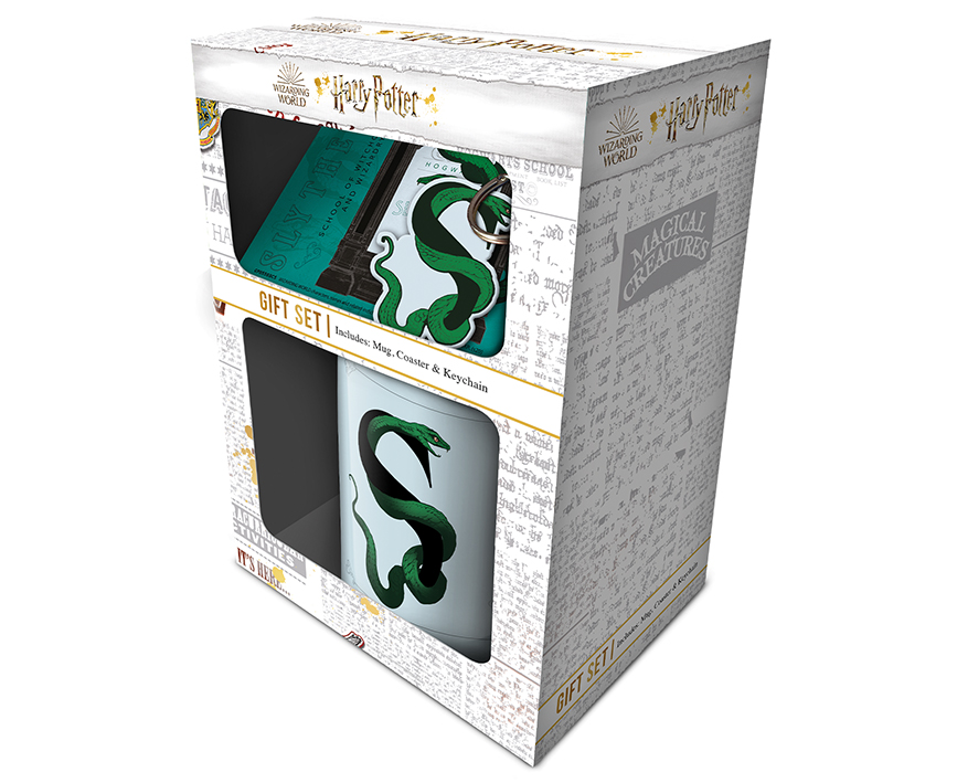Harry Potter Mug Coaster And Keychain Set. The set contains 11oz Ceramic Mug, coaster and rubber Keychain all featuring print relating to house Slytherin from Harry Potter. It comes in a gift box making it ideal to gift Harry Potter fans. Wash and Care instructions on the packaging. It is a licensed product.
