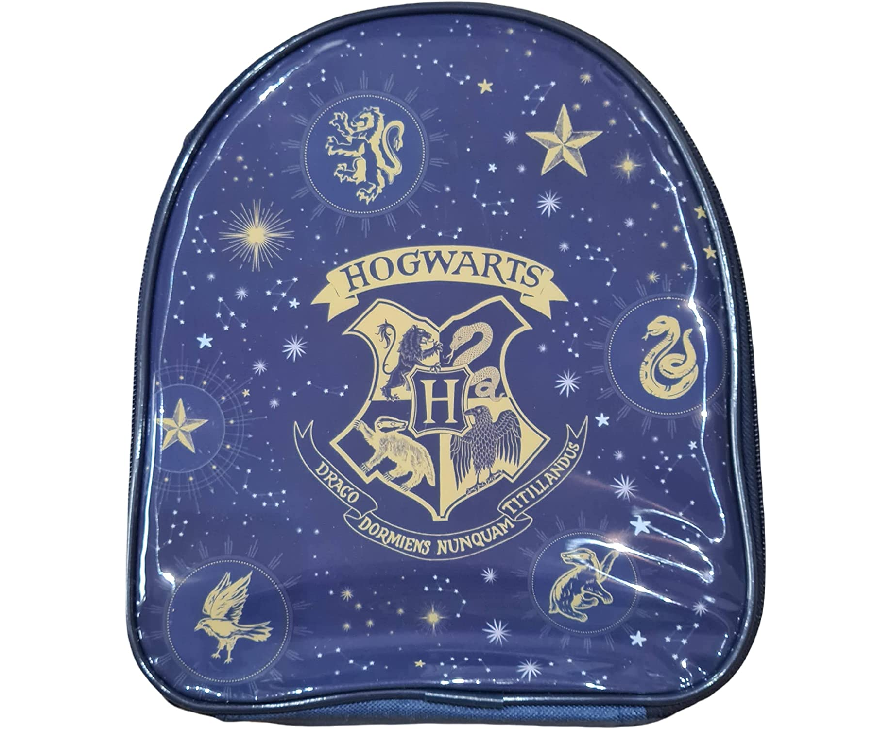 Harry Potter Girls Lunch Bag is a blue colour insulated lunch bag for kids. Lunch Bag features Hogwarts and houses crest print from Harry Potter. There is a carrying handle and zipped up compartment for storing your lunch. Lunch bag is made from Polyester, PVC and PEVA and measures approximately 25x20x9 cm. Wash and care instructions label attached. 100% licensed product.