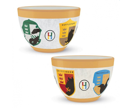 Harry Potter Huggy Mug. The mug is multi coloured and features all four houses Gryffindor, Ravenclaw, Hufflepuff and Slytherin crest print. It can hold 22oz/630ml and comes in a gift box making it ideal to gift Harry Potter fan. Wash and care instructions on the packaging. This mug is an official and licensed product.
