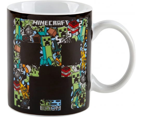 Minecraft Black Ceramic Mug. It features print from the popular video game Minecraft. It is a black colour mug and can hold 11oz. Not suitable for dishwasher or microwave use. Wash and care instructions on the packaging. Comes in a gift box making it ideal to gift Minecraft fan. This mug is an official licensed product.