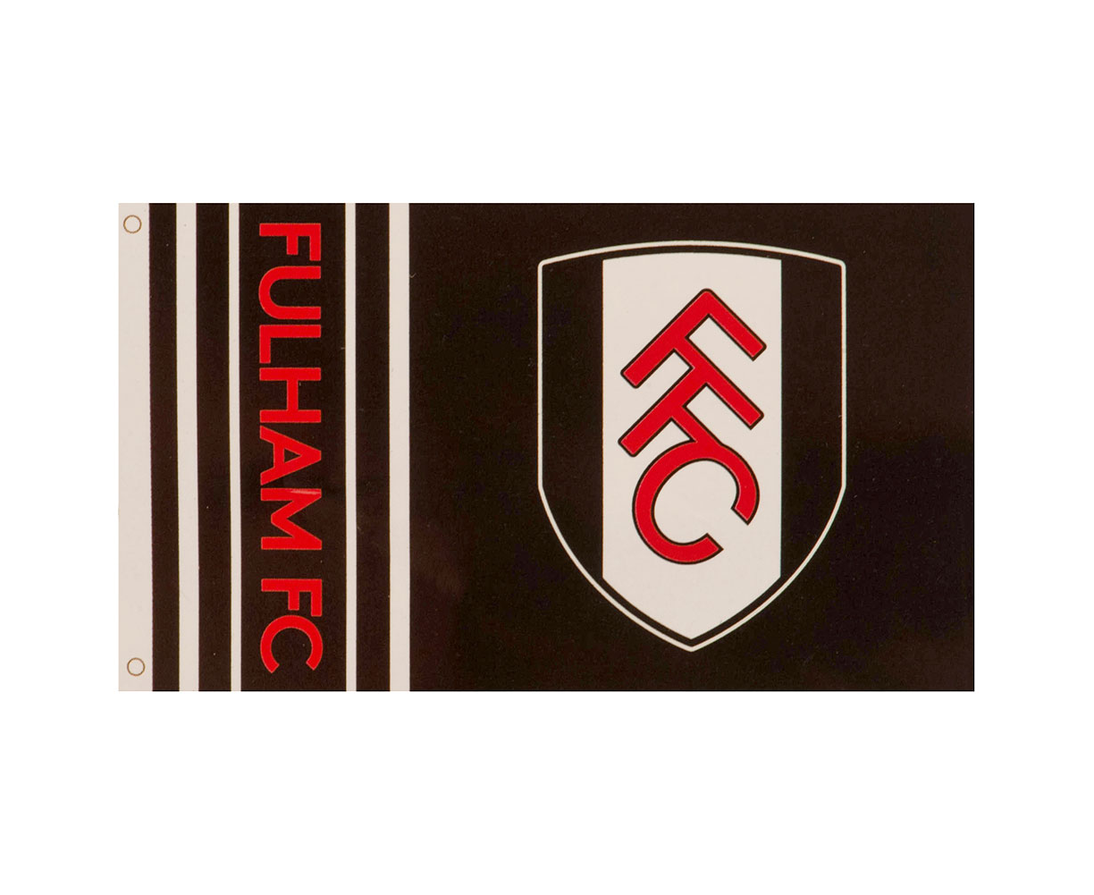 Fulham Wordmark Crest Flag. It is black colour and made of 100% Polyester. The flag measures approximately 150x90 cm and features club crest and text FULHAM FC on the front. This flag makes a nice gift to Fulham FC fan which can be hung up in a room or taken to the match. It is an official licensed product.