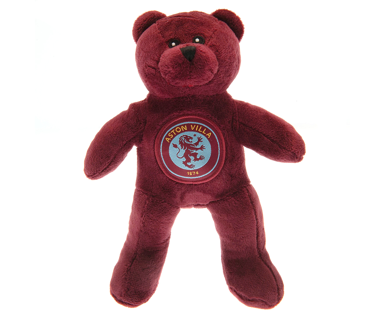Aston Villa Solid Bear. It is a soft to touch plush claret colour bear. Filled with pellets and comes with a club crest on the chest. This bear measures approximately 20 cm tall and can be perfect gift to Aston Villa FC fan. Wash and care instructions on the label. It is an official licensed product.