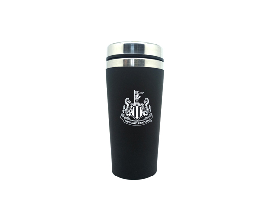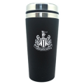 Newcastle United Aluminium Travel mug. It is a black colour handless travel mug with holding capacity of approximately 450ml. It features club crests on the outer surface, has a detachable cap for filling the liquid and matt finishing to give glossy look. Care instructions label attached. This is an official licensed product.
