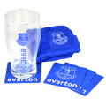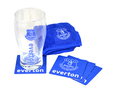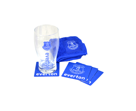 The Official Everton Wordmark Mini Bar Set contains a pint glass, 4 Beer mats and also has a bar towel all featuring the Everton club crest on the front. Perfect for a day or night in watching the big game. This Mini Bar Set also makes a great gift for any Everton supporter, packaged in a blister pack with a euro hook. This is an Official licensed Everton FC Merchandise.