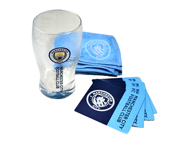 The Manchester City Wordmark Mini Bar Set contains a pint glass, 4 beer mats and a bar towel all featuring the Manchester City club crest. This bar set will be perfect for a day or night watching the big match. It can be part of your glassware and can be ideal to any Manchester City fan. Packaged in a blister pack with a euro hook. Not suitable for microwave or dishwasher. This is an official licensed merchandise. 5015860157653