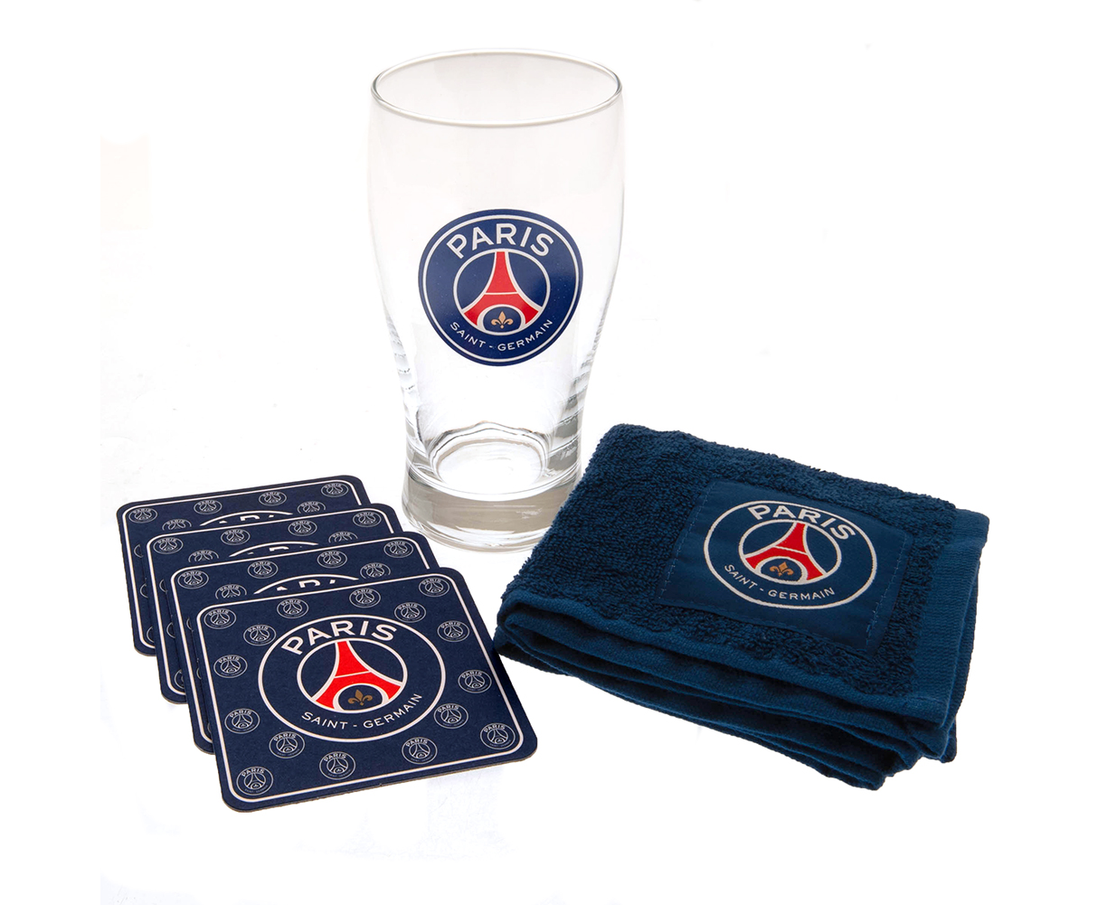 The Paris Saint Germain Crest Mini Bar Set contains a pint glass, 4 beer mats and a bar towel all featuring the Paris Saint Germain club crest. This bar set will be perfect for a day or night watching the big match. It can be part of your glassware and can be ideal to any Paris Saint Germain fan. Packaged in a blister pack with a euro hook. Not suitable for microwave or dishwasher. 100% official licensed merchandise.
