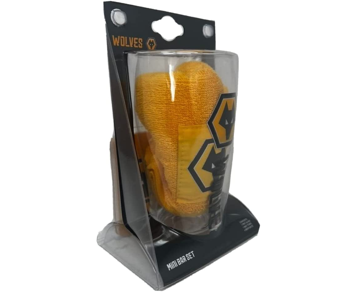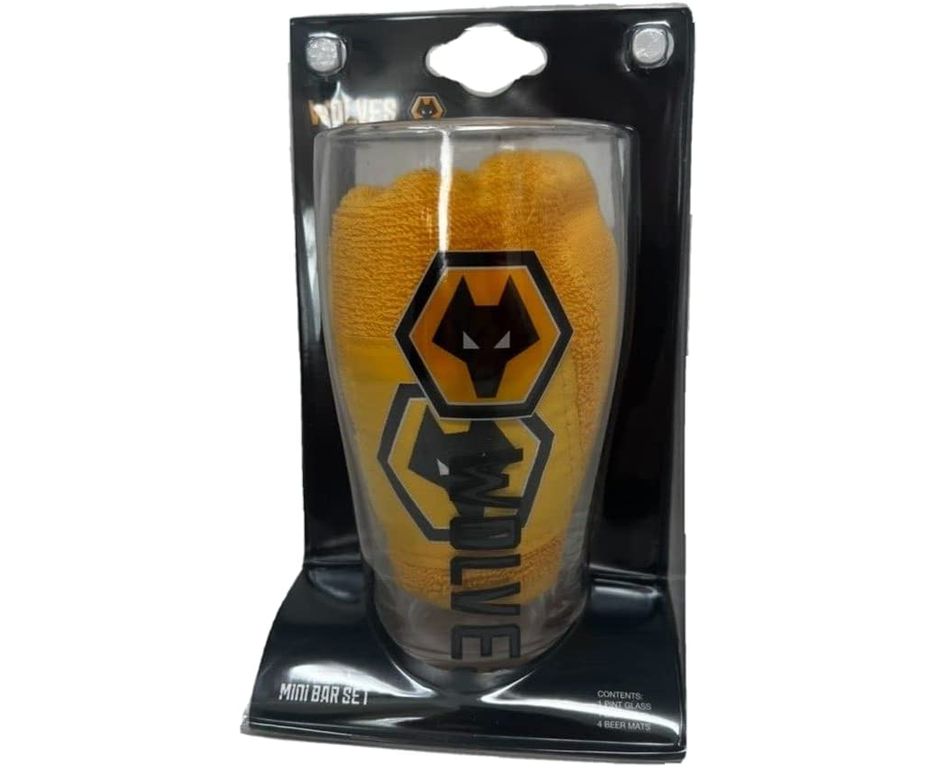 Wolves Wordmark Mini Bar Set. It contains a pint glass, 4 beer mats and a bar towel all featuring Wolves FC club crest. This bar set will be perfect for a day or night watching the big match. It can be part of your glassware and can be ideal to Wolves FC fan. Packaged in a blister pack with a euro hook. Not suitable for microwave or dishwasher. This is an official licensed product.