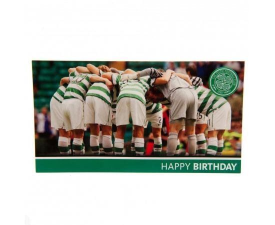 Celtic Birthday Card Players With Badge. The card features club players, club crest, birthday message and comes with badge. It comes complete with an envelope and will be nice idea to wish Celtic FC fans. Made of paper and 100% Official Licensed Product.
