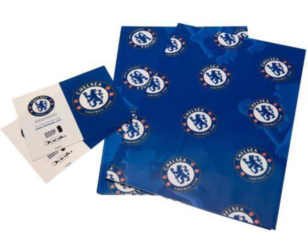 Chelsea Gift Wrap. The gift wrap comes with 2 sheets of wrapping paper measuring 70cm x 50cm and 2 gift tags. Both the sheet and tag features club crest print. Will be great idea to wrap your present/gift to Chelsea FC fan. Made of paper and 100% Official Licensed Product.