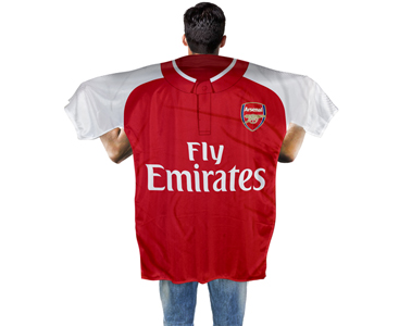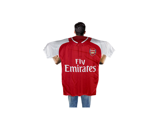 Arsenal Kit Shaped Banner or Body Flag is made in club colours with dye sublimation printing. It is a kit replica featuring club crest, sponsor and is made of 100% Polyester. The banner measures approximately 145x114 cm and is perfect to display on your wall or use as a body flag during the match to pledge your allegiance to your team. 100% Official licensed product.