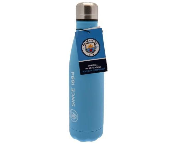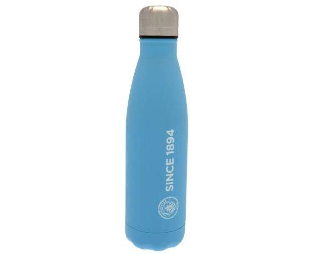 The Manchester City Thermal Flask is is made of stainless steel. It is sky Blue in colour with a matt finish and features club crest and text SINCE 1894. It has holding capacity of 500ml and keeps hot liquids hot for up to 12 hours and cold drinks cool for up to 24 hours. Wash and care instructions on the label. The flask is official licensed product.
