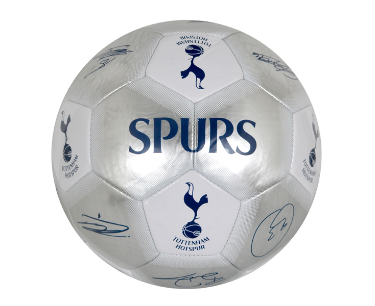 This Tottenham Signature Football is a metallic finish size 5 ball. It is made in silver colour with stitched panel design. It features club players printed signatures and club crest across its surface. This ball is made of PVC (synthetic) and will make a fantastic gift for any Tottenham fan. This ball is not inflated for ease of posting, need to inflate it with a pump (not provided). This ball is an official licensed product.