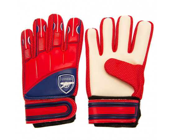 Arsenal Goalkeeper Gloves - Junior. It provides protection and comes in red and navy colours. Features club crest print on the front. Bandage style wrist with velcro closure provides comfort and support for the goalkeeper gloves providing good all-round grip. Wash and care instructions at the back of packaging. 100% official licensed product.