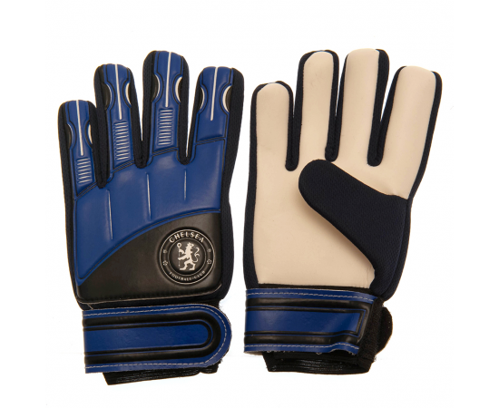 Chelsea Goalkeeper Gloves - Junior. It provides protection and comes in black and blue colours. Features club crest print on the front. Bandage style wrist with velcro closure provides comfort and support for the goalkeeper gloves providing good all-round grip. Wash and care instructions at the back of packaging. 100% official licensed product.