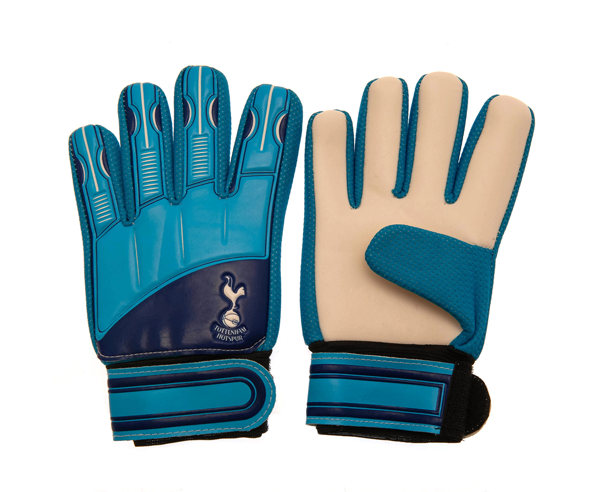 Tottenham Goalkeeper Gloves - Youth. It provides protection and comes in blue colour. Features club crest print on the front. Bandage style wrist with velcro closure provides comfort and support for the goalkeeper gloves providing good all-round grip. Wash and care instructions at the back of packaging. 100% official licensed product.