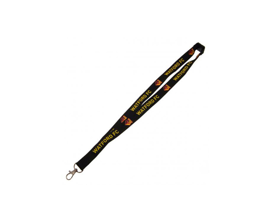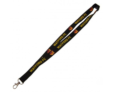 The Watford Lanyard is made of nylon. It is black colour and features multiple club crests and print "WATFORD FC". It has a metal clip to hold your card or whistle or similar object. This lanyard measures approximately 84x2cm. It is an official licensed product.