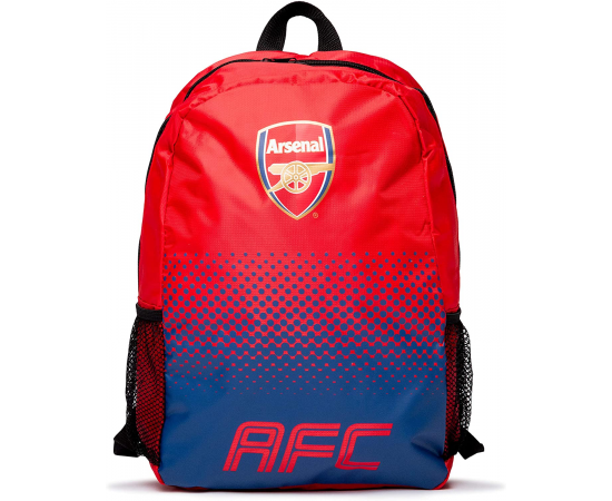 The Arsenal Fade Backpack is a new design backpack. It has a zip-up main compartment ideal to carry your text book and stationery items. It has meshed side pockets to hold water bottle and adjustable soft shoulder straps. The backpack comes in club colours with fade design background. It features printed club crest and text "AFC" on the front panel. It is made of 100% Polyester. The bag is ideal for use at school, on holiday or even going for the match. 100% official licensed product.