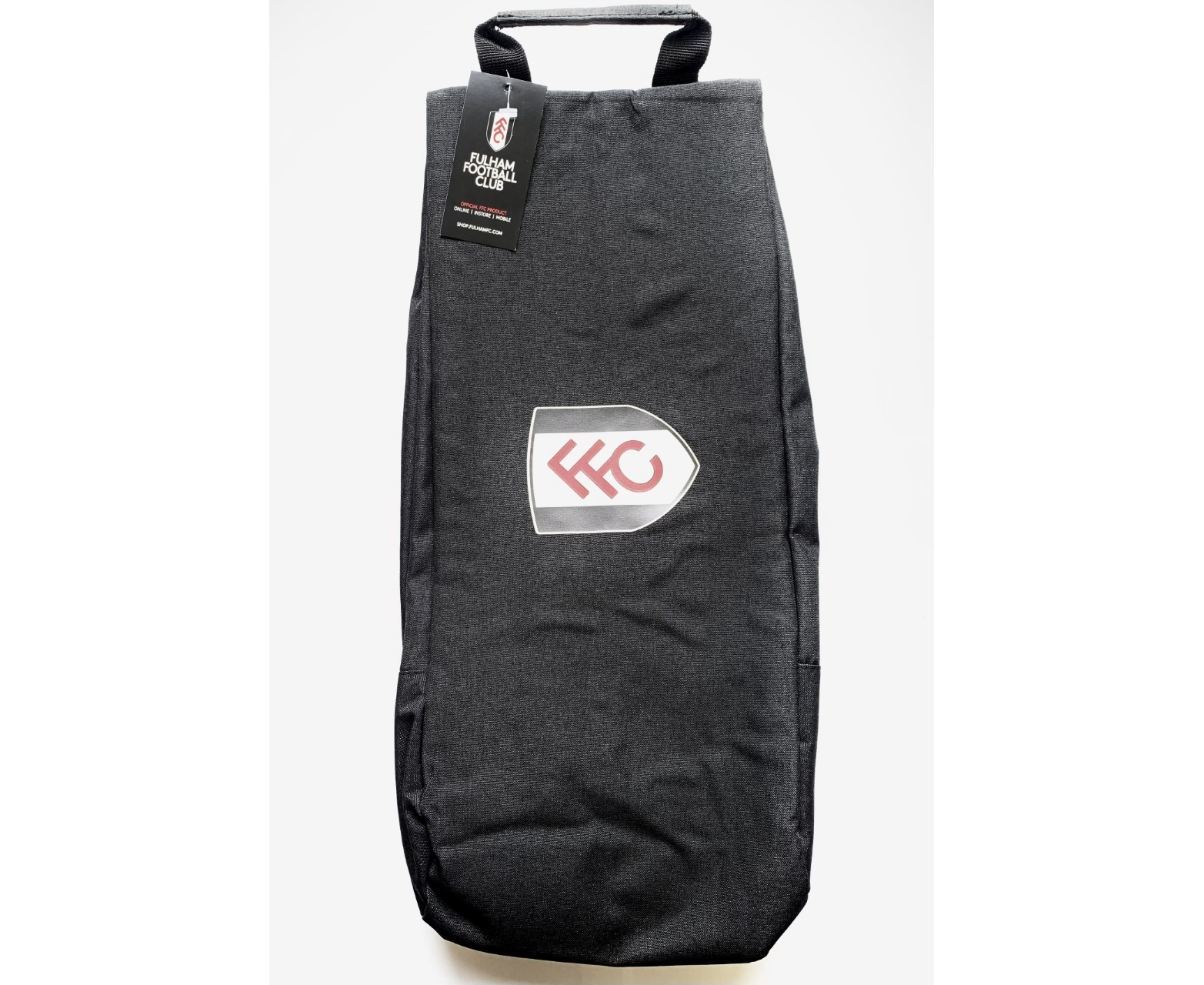 Fulham Shoe Bag is a zip-up shoe bag and comes with a carrying handle. This shoe bag is black colour and features club crest print. Measures approximately 44x18x12 (cm) and is made from 100% Polyester. This shoe bag is ideal for carrying your football boots or your shoes and will be nice gift idea to Fulham FC fans. It is an official licensed product.