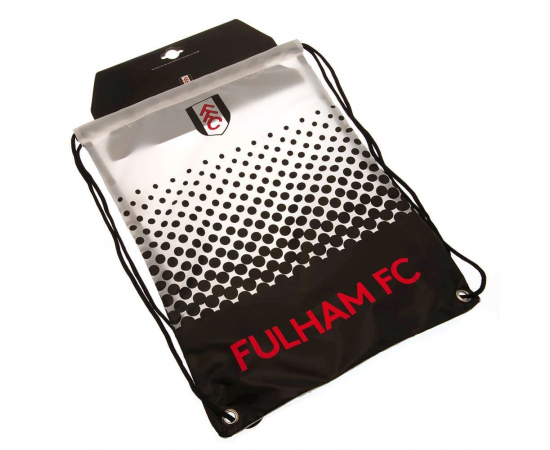 Fulham Fade Gym Bag. It features printed club crest and text "FULHAM FC" stenciled on the front. The gym bag is in black and white colours with a simple black drawstring design. It measures approximately 45cmx34cm (flat). Has a large main compartment making it easily adapatable as a school or gym bag ideal for carrying training gear, shoes or boots. It is made of 100% Polyester. It is an official licensed product.