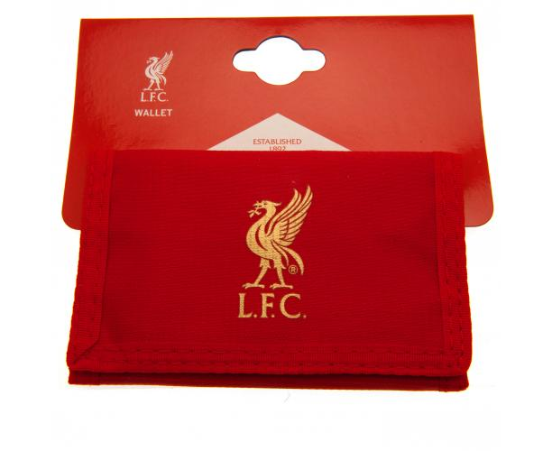 Liverpool Colour React wallet. It is red colour wallet, features gold club crest on the front and white crest on the back. The wallet comes with a velcro fastening and inner compartments for cash and cards. The wallet is made of 100% Polyester. It is an official licensed product.