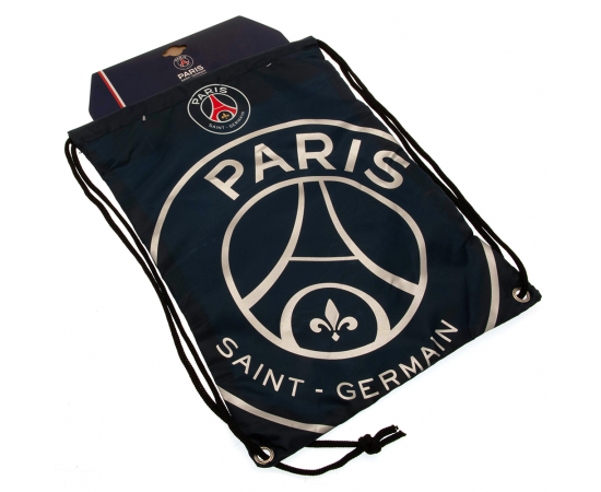 Paris Saint Germain Colour React Gym Bag. It features large printed club crest on the front. The gym bag comes in navy blue colour with simple black drawstring design. It measures approximately 45cmx34cm (flat). It has a large main compartment making it easily adapatable as a school or gym bag ideal for carrying training gear, shoes or boots. It is made of 100% Polyester. It is an official licensed product.