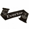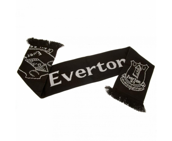 Everton React Scarf. It is black colour scarf with stitched tassles at each end. The scarf features club crest and text Everton print. Its a 10 Gauge jacquard scarf made from 100% Acrylic fabric. Wash and care instructions attached. It will be nice gift to Everton FC fans and is perfect for keeping warm during the colder months. It is an official licensed product.
