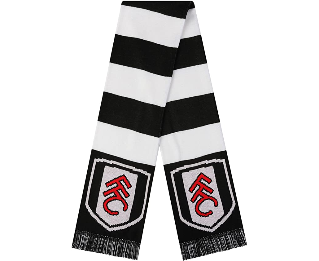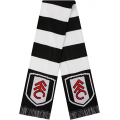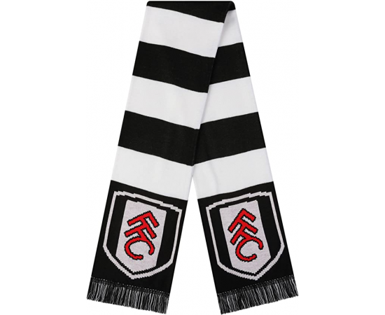Fulham Bar Scarf. It comes in black and white colours with stitched tassles at each end. The scarf has club crest on both ends and features in bar pattern. It is a 10 Gauge scarf made from 100% Acrylic fabric. Comes with wash and care label. The scarf will be ideal gift to Fulham FC fan and is perfect for keeping warm during the colder months. It is an official licensed product.