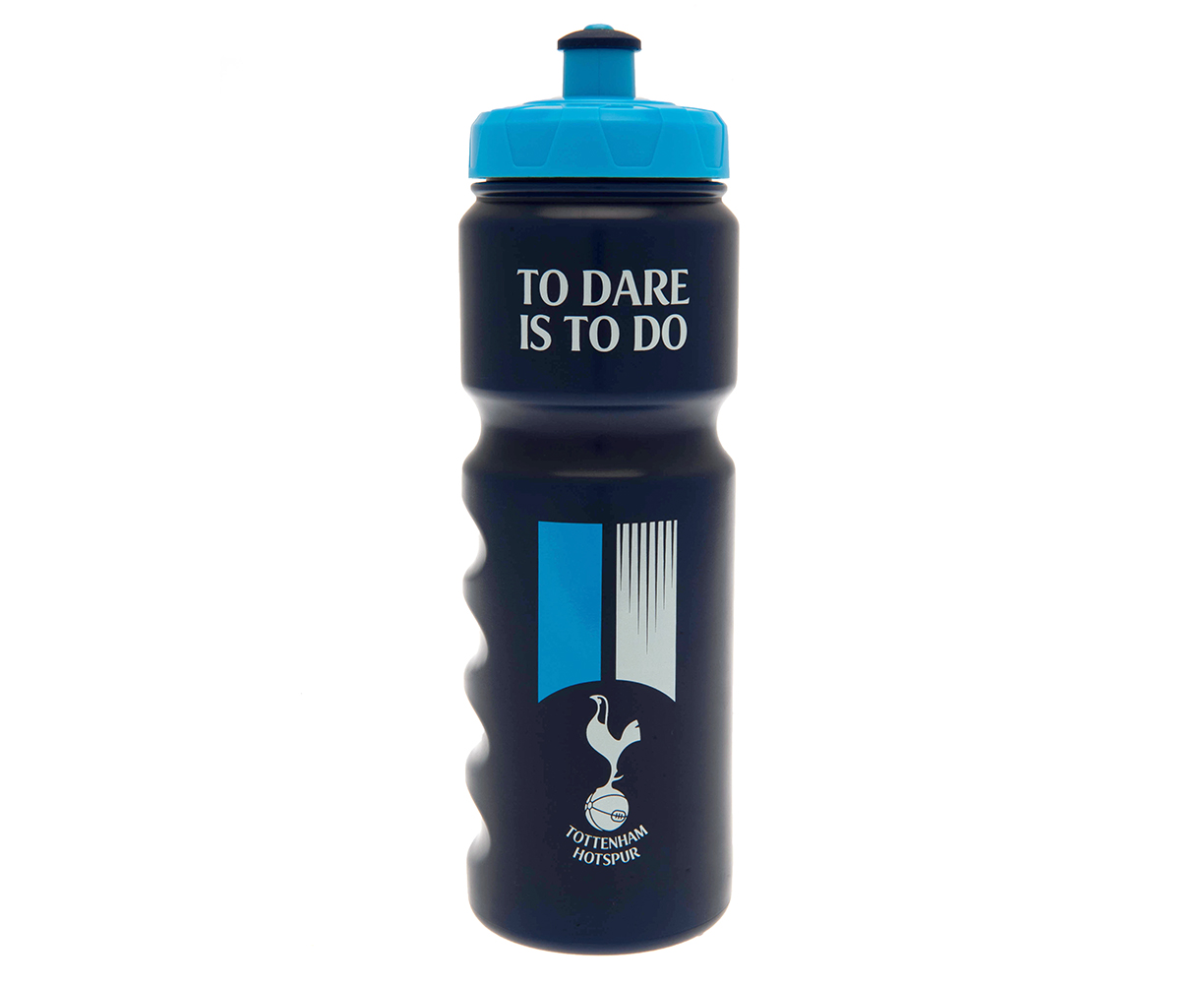 Tottenham Plastic Water Bottle - 750ml. It is navy colour bottle and can hold up to 750ml. Features club crest, club name and text TO DARE IS TO DO print on the surface. It will be a nice gift idea to Tottenham FC fan. Not suitable for carbonated drinks and dishwasher. 100% official licensed product.