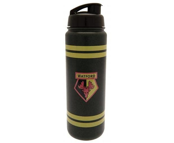 Watford Water Bottle is drinks bottle black and yellow in colour. This flip top sports bottle is made of plastic and can hold upto 750ml. It features club crest and measures approximately 24x7 cm. Will be nice gift to Watford fans. It is an official licensed product.