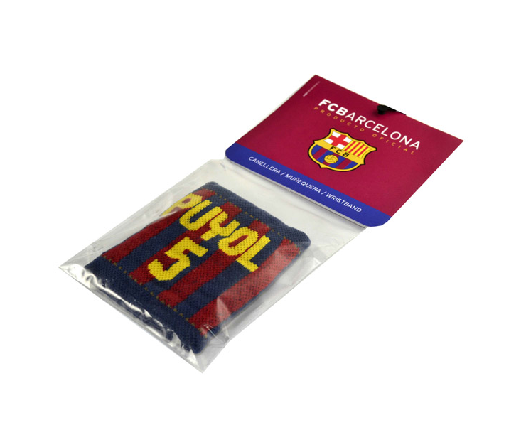 Barcelona Puyol Player Wristband. It is a blue and burgundy colour stripe wristband. Features text "PUYOL 5" on the front and text "FCB" at the back. This wristband is perfect for wearing in training or on the pitch and will be a nice gift idea to FCBarcelona fan. Official licensed product.